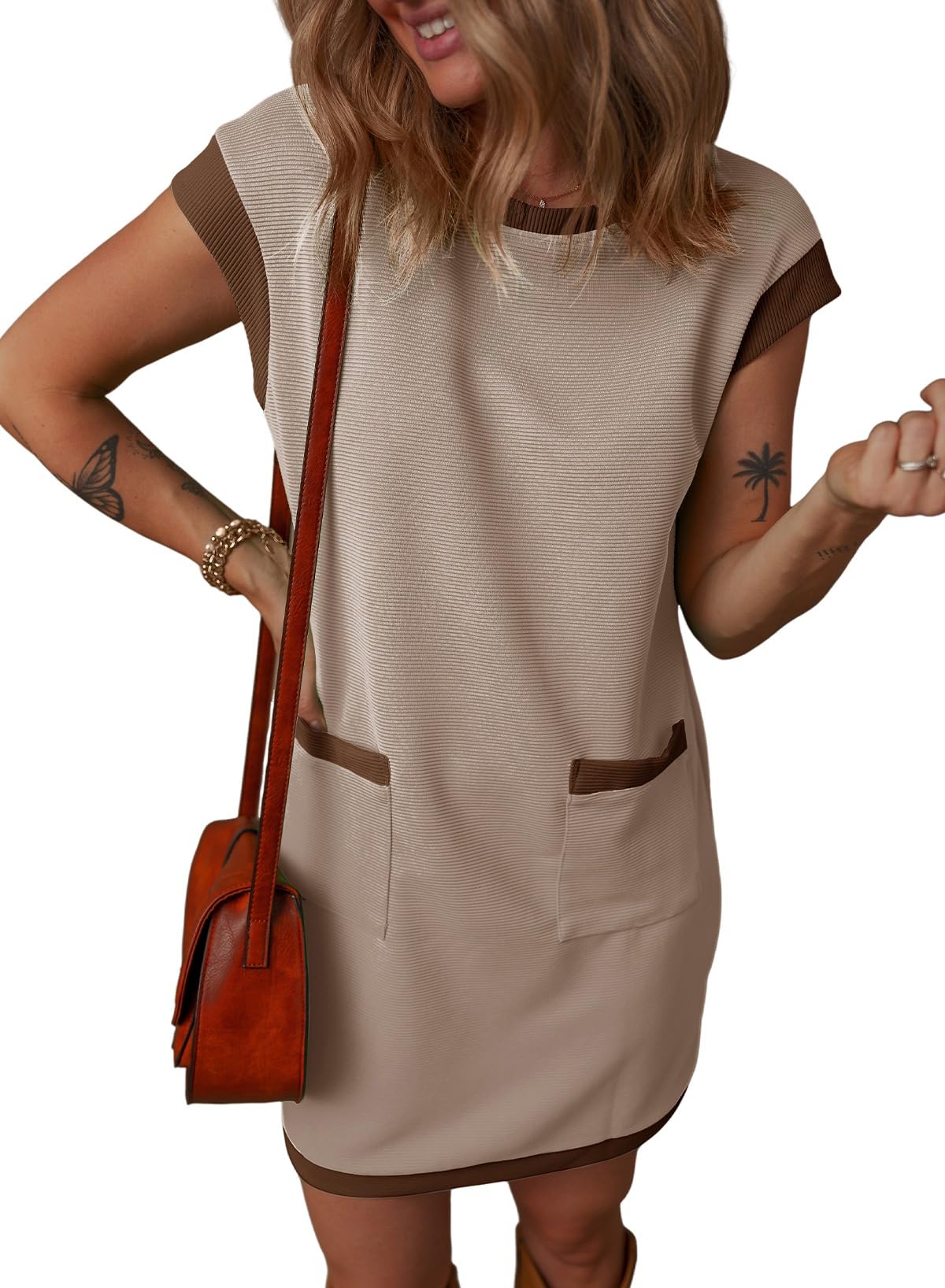 1 x lĂ€ssiges Damen-T-Shirt-Kleid mit FlĂŒgelĂ€rmeln und Farbblock-Muster und Taschen