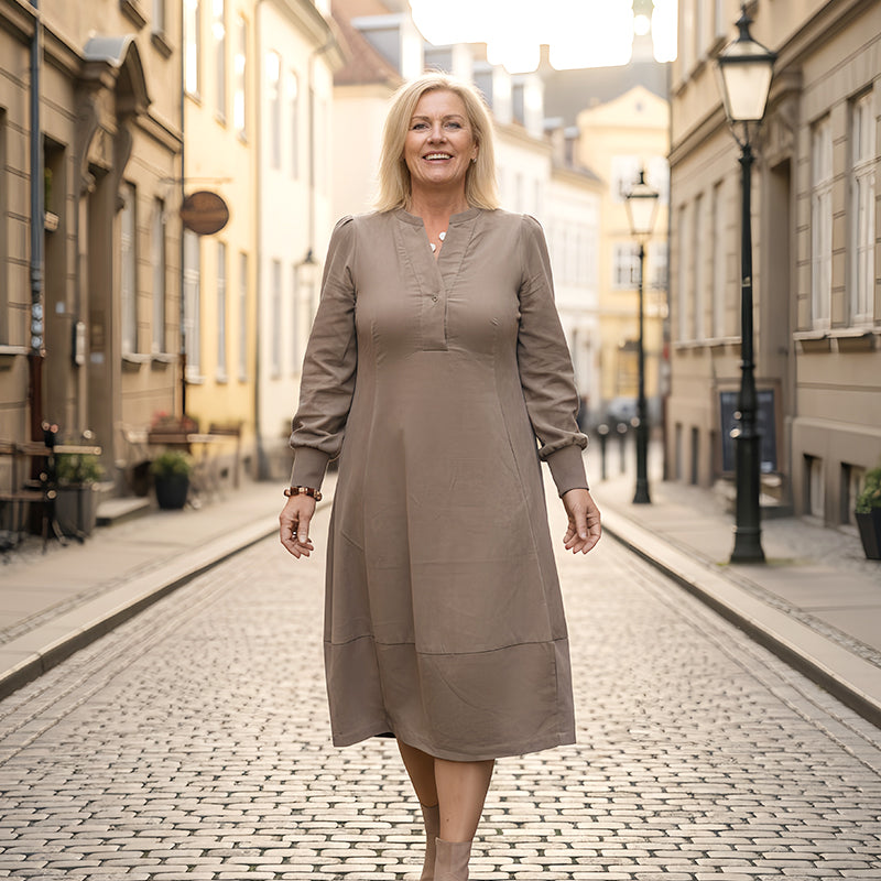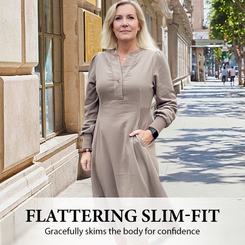 DURCHDACHTE DETAILS: Die Knopfleiste vorne verleiht einen Hauch klassischer Eleganz, während die beiden großzügigen Seitentaschen praktischen Nutzen bieten, ohne die klaren Linien des Kleides zu beeinträchtigen.