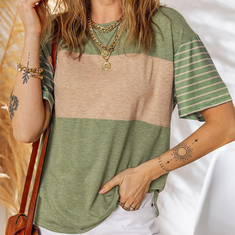 Lässiges Damen-Oberteil mit Rundhalsausschnitt, gestreiftem Farbkontrast und kurzen Ärmeln