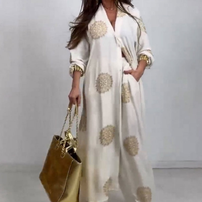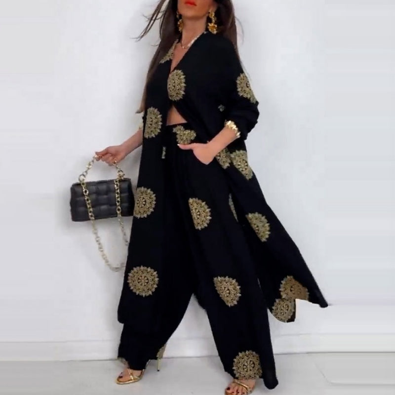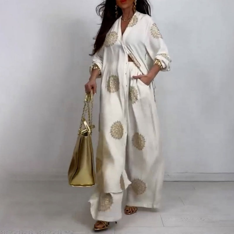 SCHICKES UND KOMFORTABLES DESIGN : Dieses zweiteilige Set besteht aus einem locker sitzenden, langen Oberteil mit V-Ausschnitt und einer modischen, bedruckten Hose mit weitem Bein und vereint Komfort und Stil für jeden Anlass.