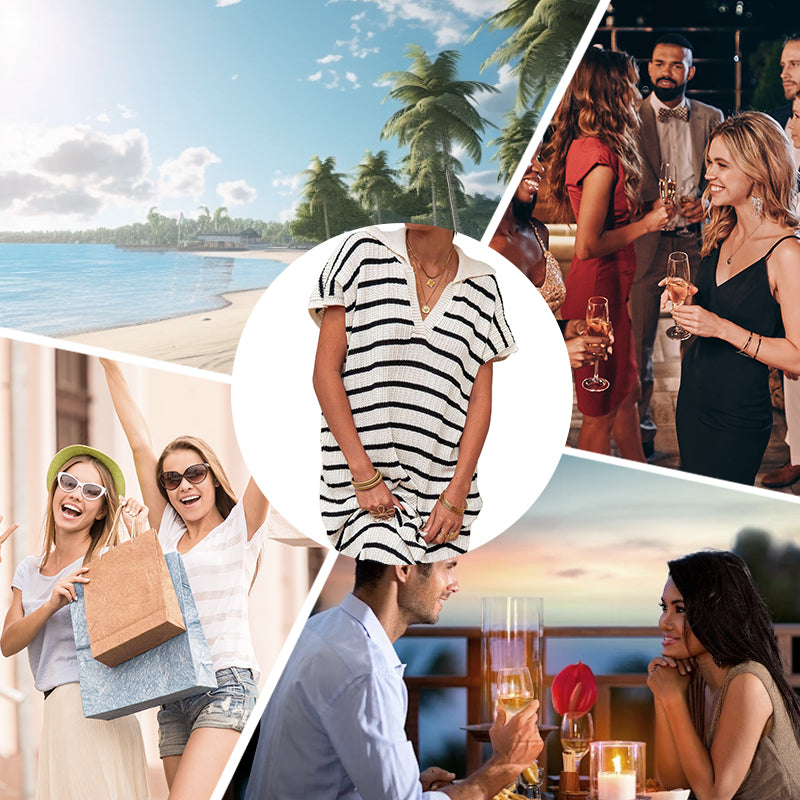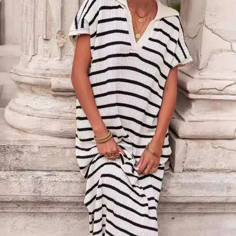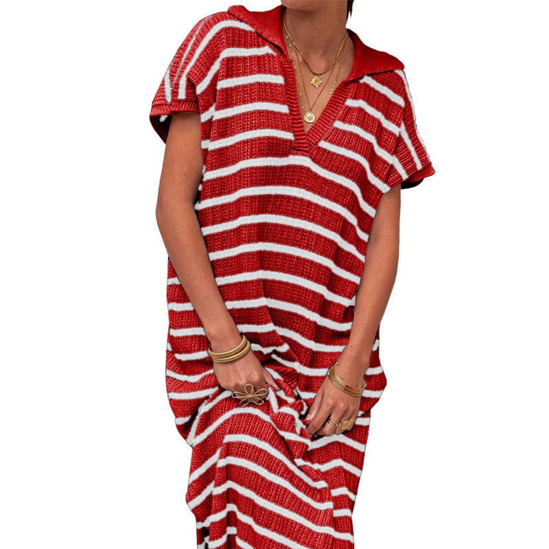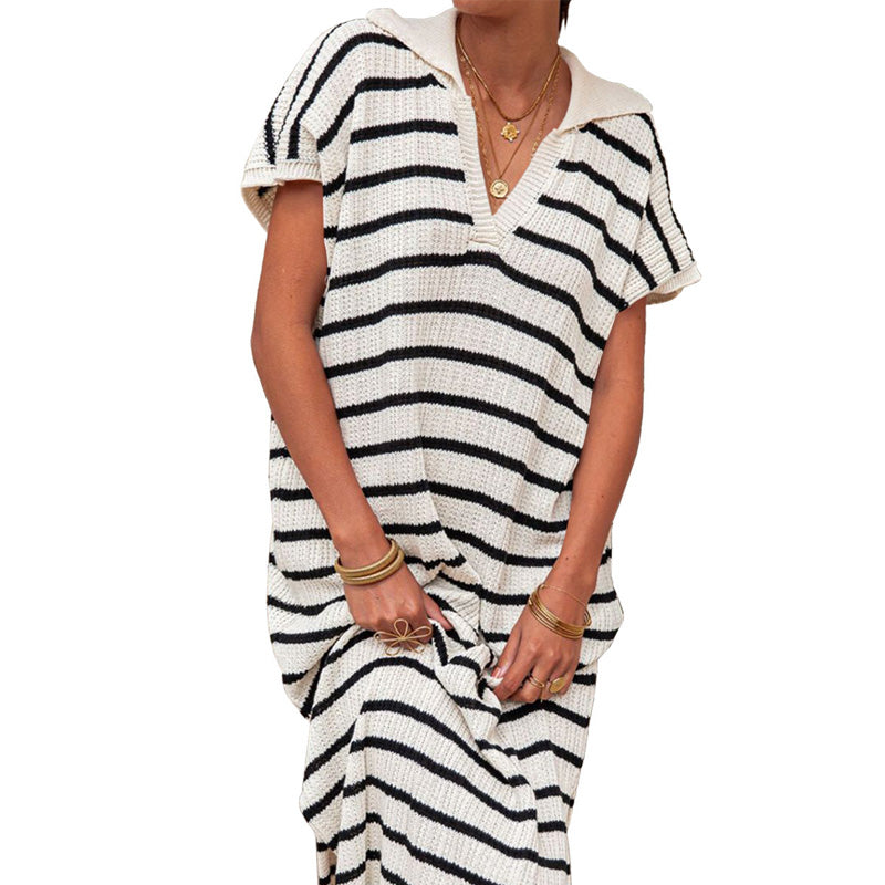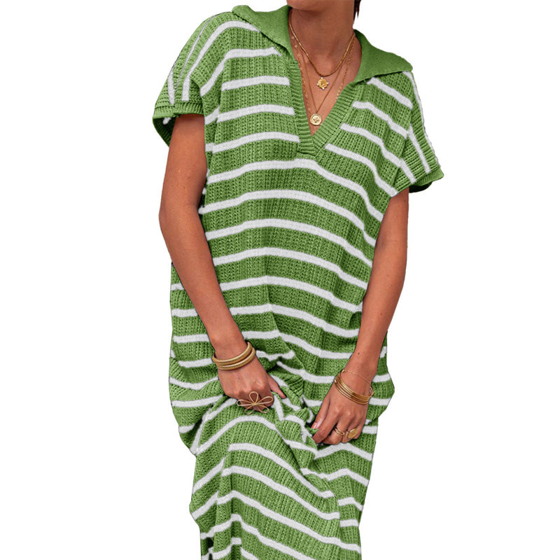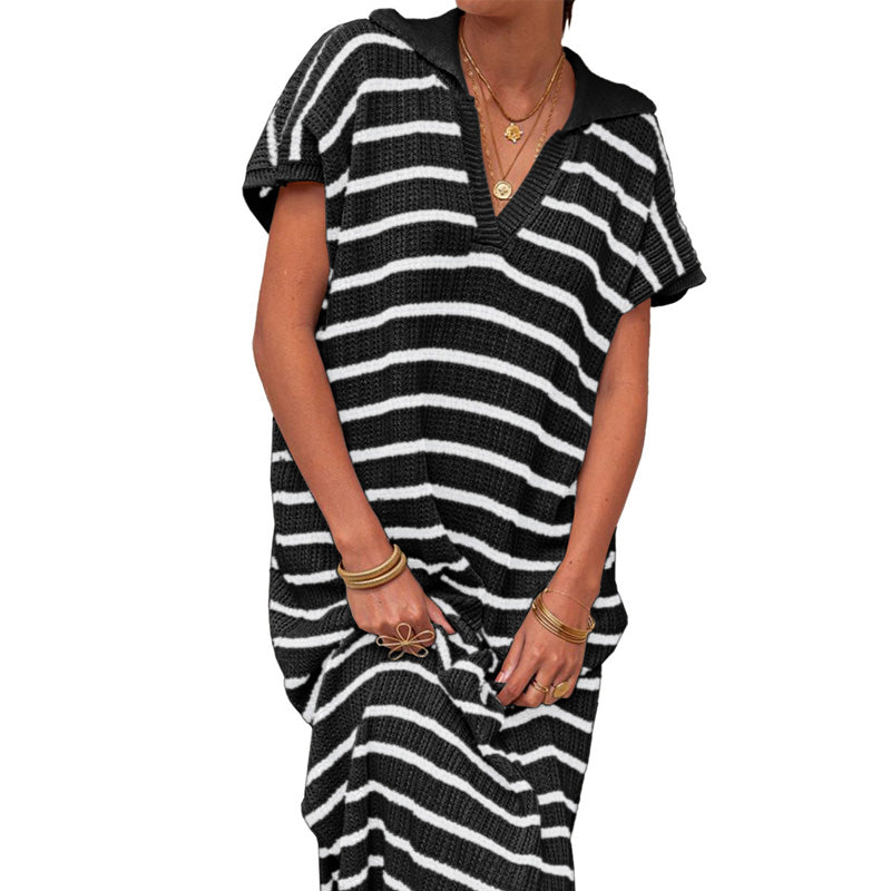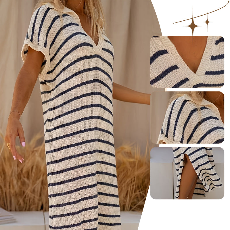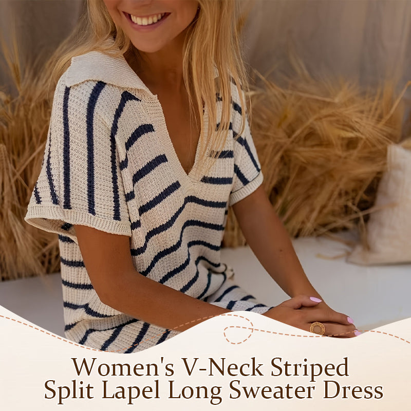 Langes Pulloverkleid mit V-Ausschnitt, Streifen und geteiltem Revers für Damen