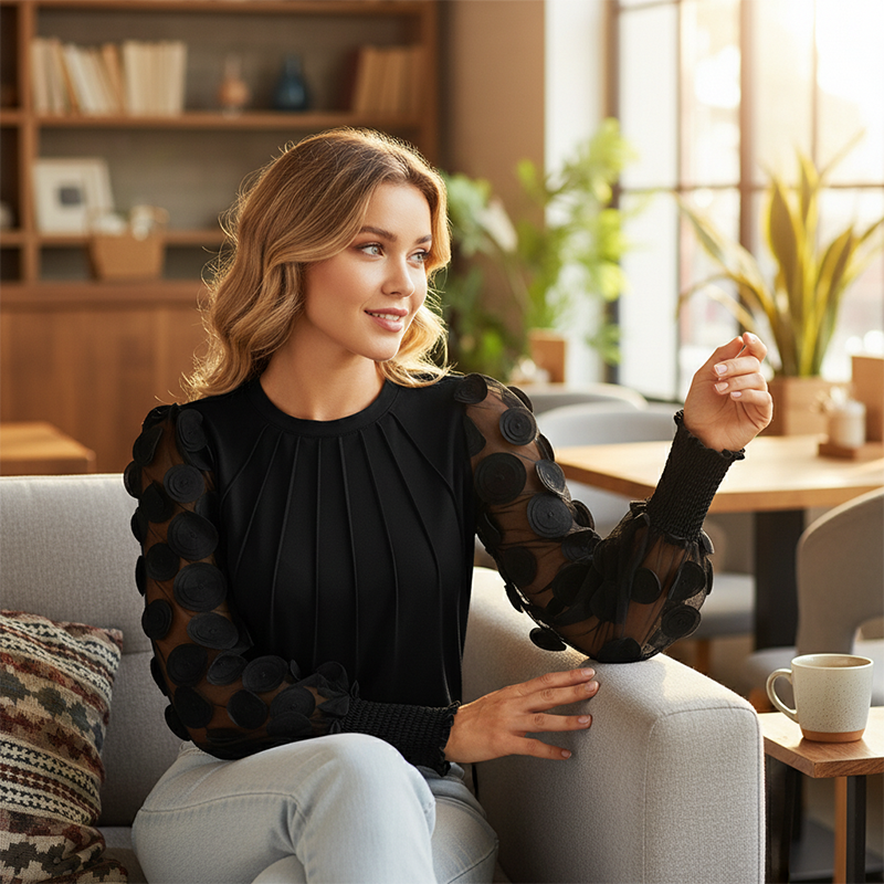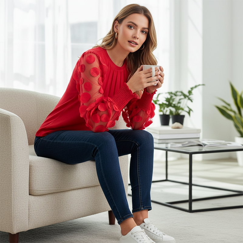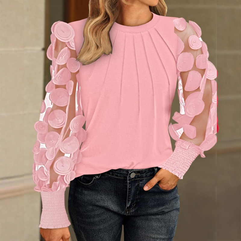 🔥HEISSER VERKAUF 49% RABATT! ✨Damenbluse mit 3D-Applikationen und Mesh-Ärmeln