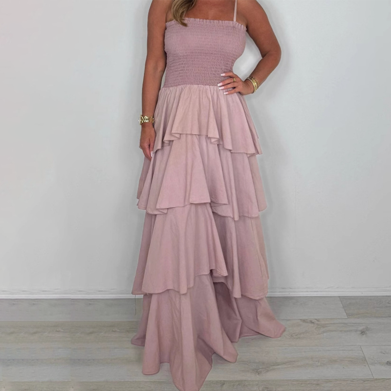 đ„°Einfarbiges Kleid mit SpaghettitrĂ€gern und gestuftem Rock