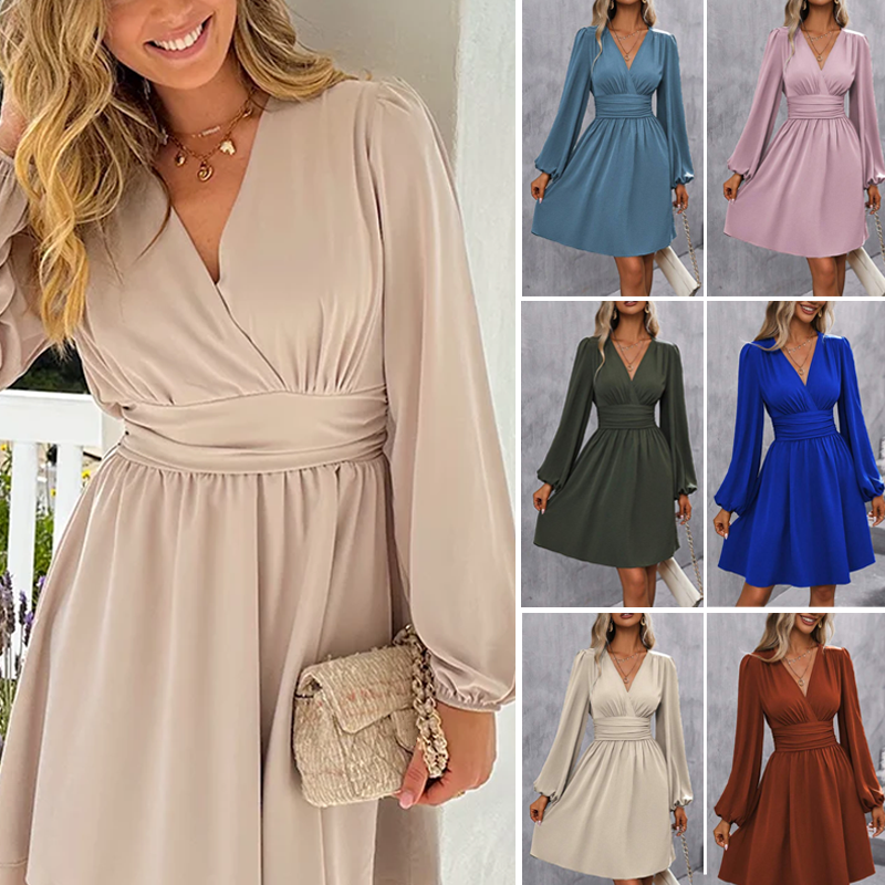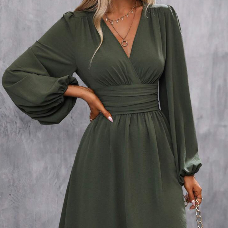 Modisches Wickelkleid für Damen mit V-Ausschnitt, Empire-Taille und Laternenärmeln
