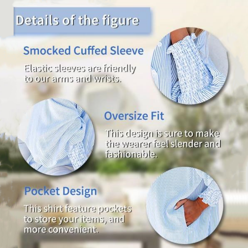 ✨💥Mittellanges gesmoktes Hemd mit gestreiftem Revers und übergroßen heruntergezogenen Ärmeln