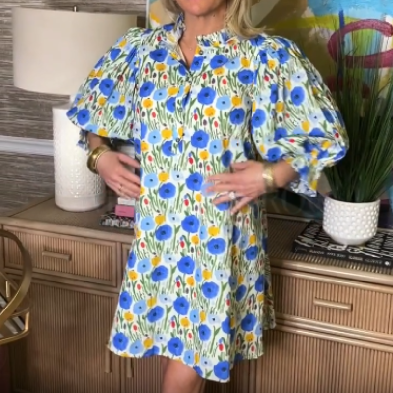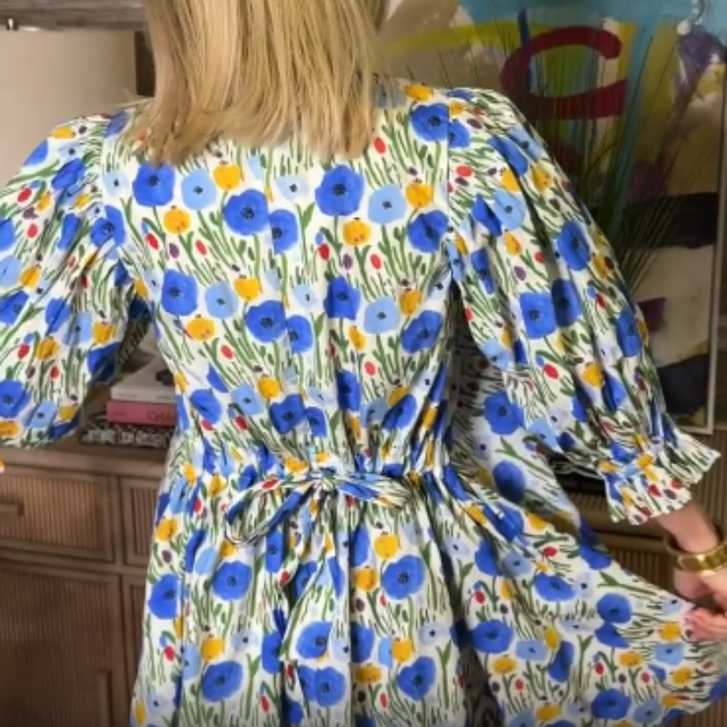 Romantischer Blumendruck : Zarte himmelblaue Blüten auf kontrastierendem Hintergrund ergeben ein zeitloses, auffälliges Muster. Der lebendige und dennoch dezente Druck lässt sich mühelos vom Brunch tagsüber zur Abendveranstaltung mit einfachen Accessoire-Wechseln kombinieren.